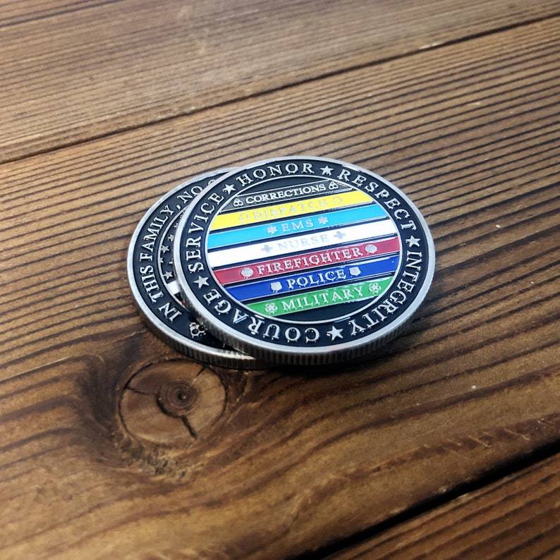 Front Side: The obverse of the coin features the American flag with lines in different colors, each representing a branch of public service. The motto "In this family, no one fights alone" underscores the camaraderie and unity among these branches.