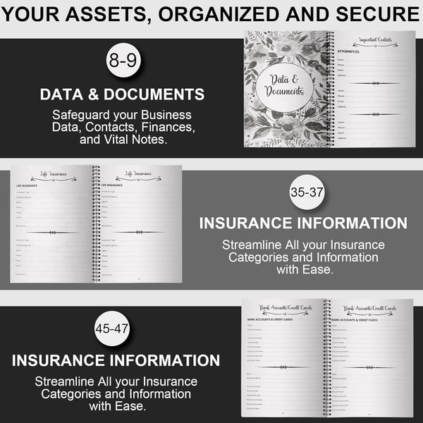Keep all your important information in one place—dependents, beneficiaries, pets, insurance, accounts, passwords, and more. Each section is clearly organized to ensure nothing is overlooked when it comes to your final wishes.