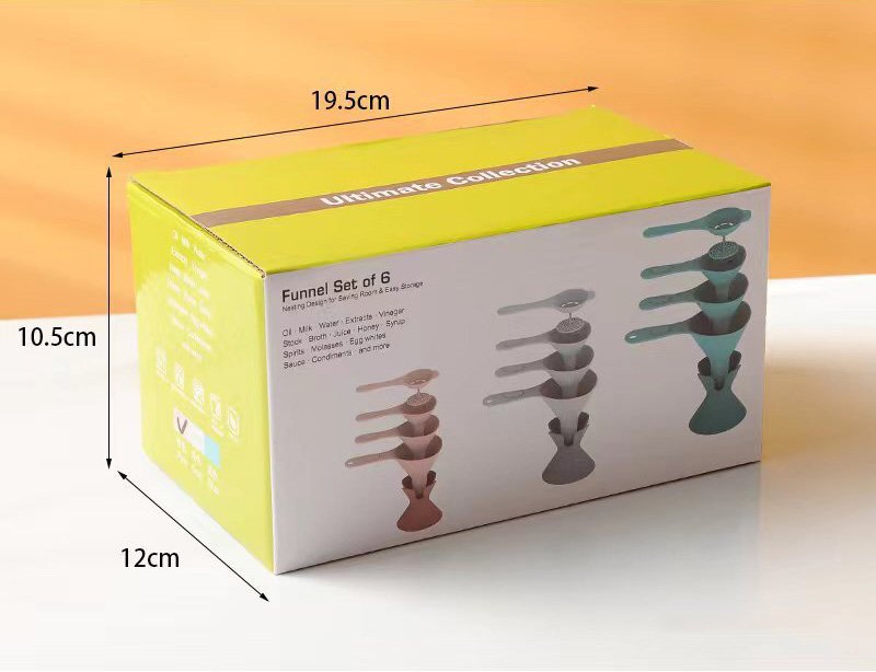 The set consists of six pieces, including three types of funnels: large, medium and small, suitable for filling different sizes of bottles and liquids; an egg separator, which can easily separate egg whites from egg yolks; a food strainer, which can be placed on the funnel to filter liquids; and a base storage, which can easily store all the funnels.
